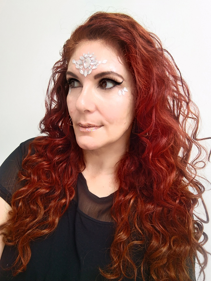 Pra essa make, escolhi usar uma sombra iluminadora e um delineado daqueles de colar, do tipo bem fácil e prático, que todo mundo pode usar. Optei também por uma pele beeem iluminada, boca com glitter holográfico com algumas partículas cor de rosa bem clarinhas e, pra finalizar, glitter do tipo que imita jóias, colado no rosto.